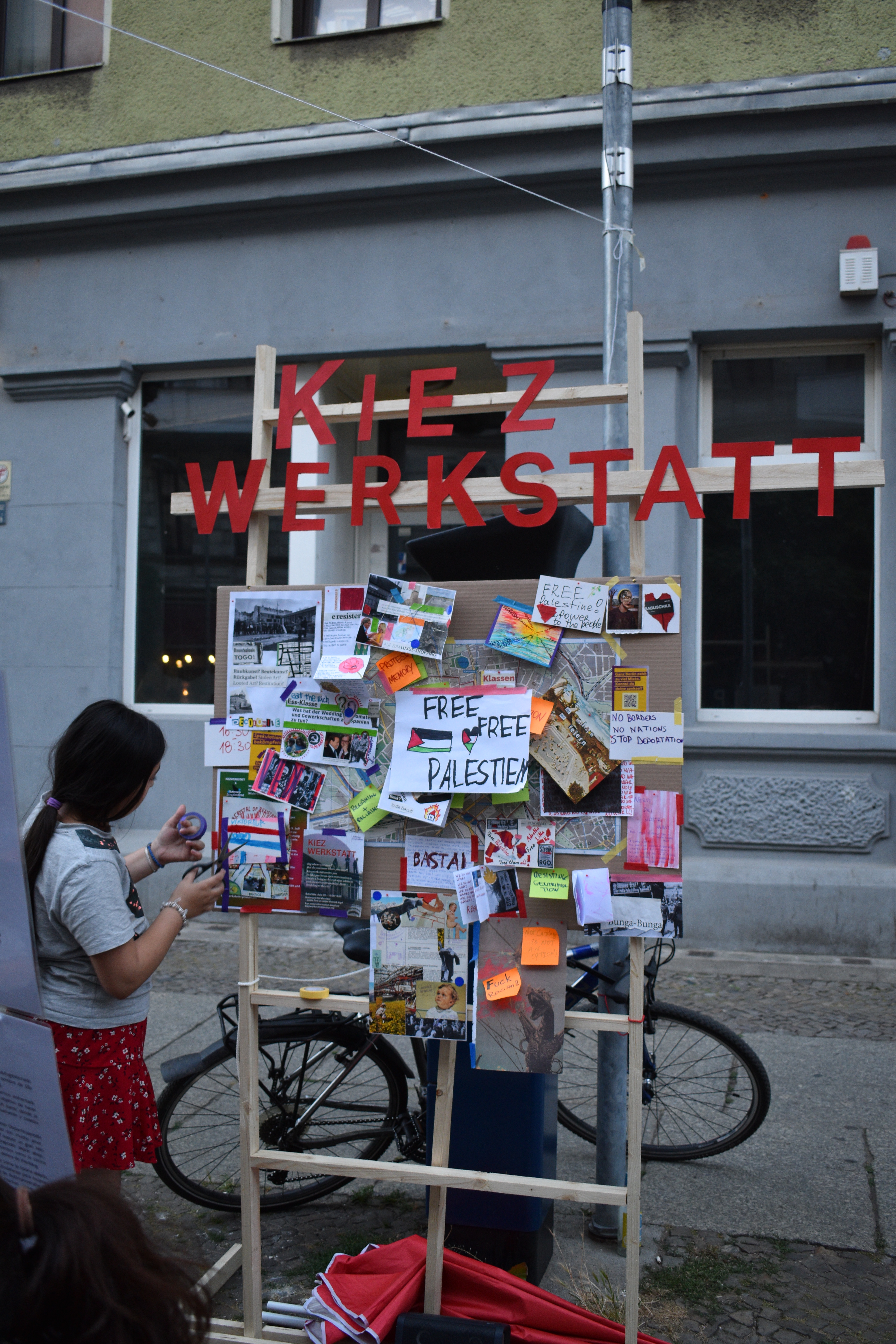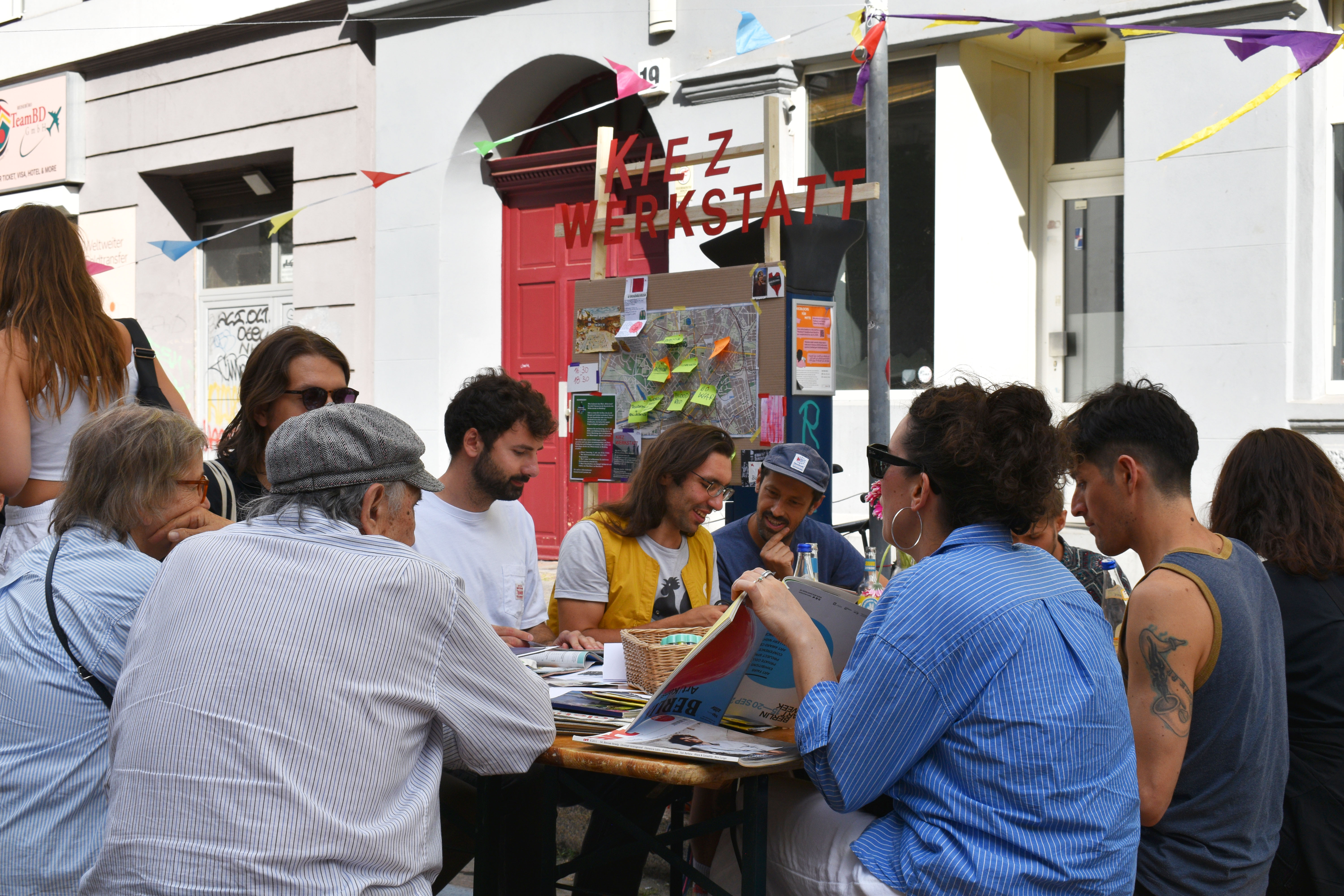 On July 5, 2025, we hosted our first Kiezwerkstatt workshop at the Buttmann Straßenfest, gathering neighbors under the red umbrella to explore the meaning of Resistance in Wedding.