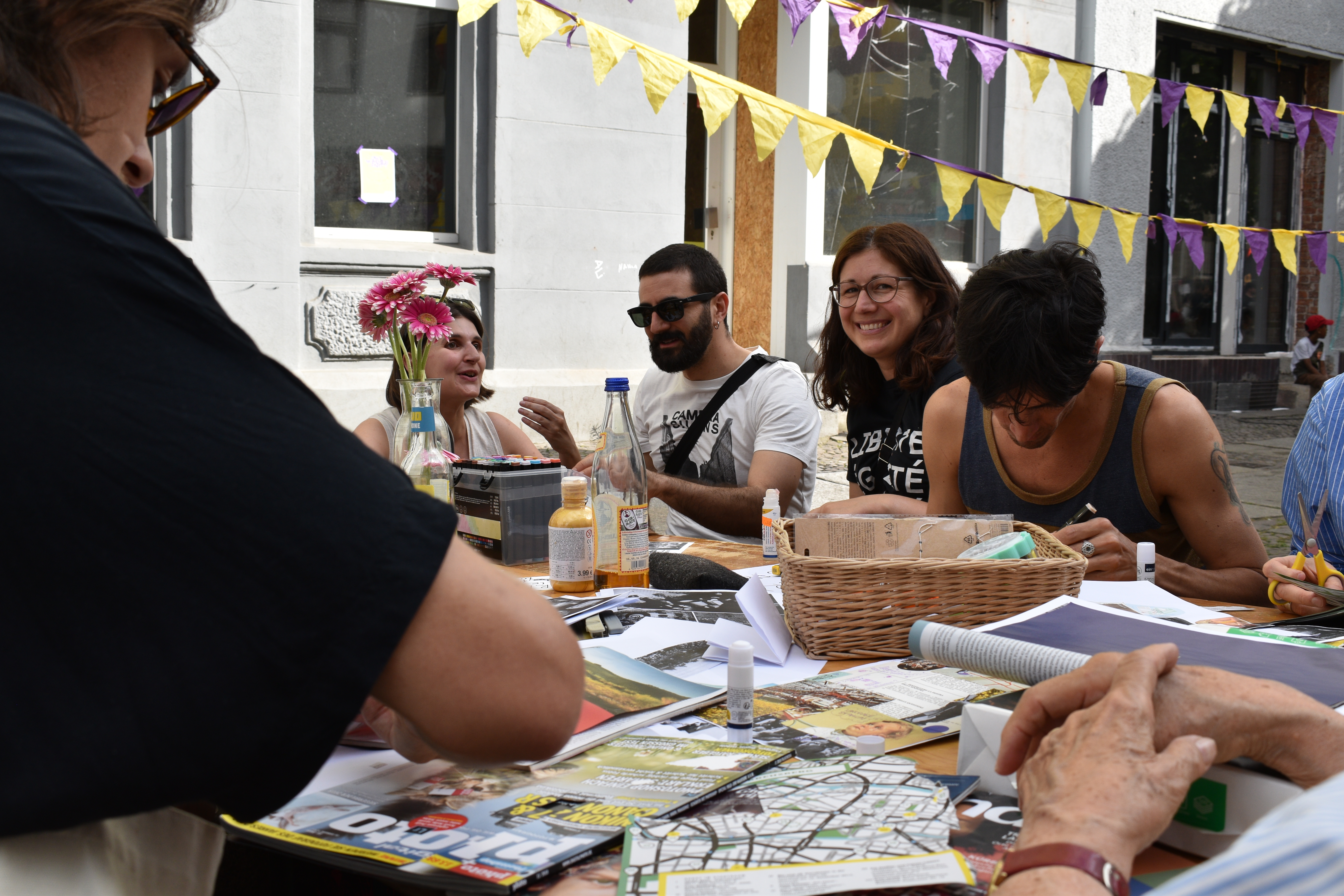 In a cozy, living-room atmosphere, participants shared memories, stories, and reflections on places of resistance across the neighborhood. These contributions were mapped collectively with stickers, notes, and words on a large neighborhood map, then transformed into zines, collages, and postcards in a hands-on creative session.